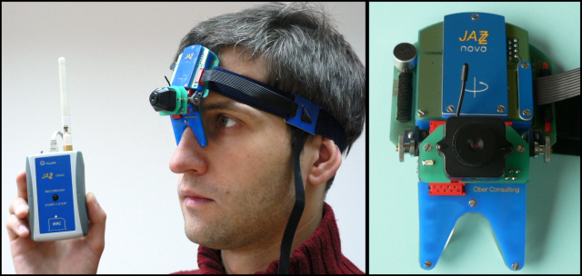 Należy zaznaczyć, że nie każdy nagłowny system do eye trackingu jest również mobilnym. Zbierając informacje na potrzeby tego wpisu, trafiłem na ciekawą „hybrydę” obu typów urządzeń nazwaną nagłownym systemem stacjonarnym, którą zaprezentowano na obrazku poniżej.