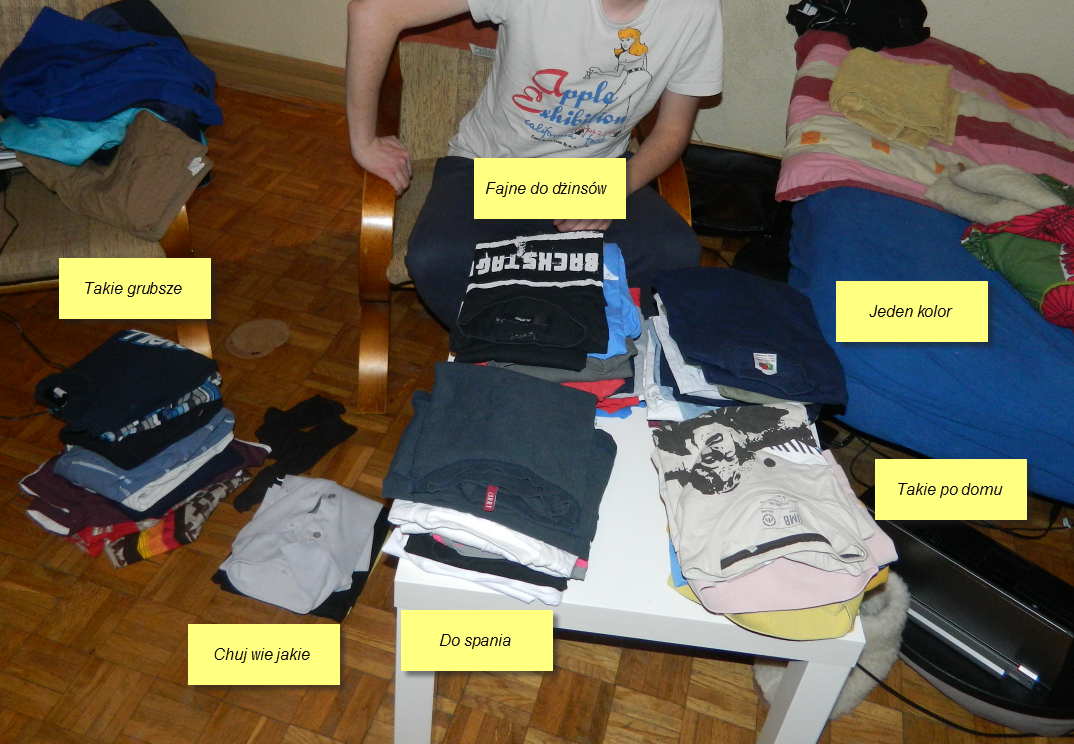 Dzisiaj przyłapałem znajomego na robieniu porządków w szafie. Z zawodowej ciekawości zapytałem, jak nazywa poszczególne kupki ubrań. Jego odpowiedź została pokazana na obrazku poniżej.