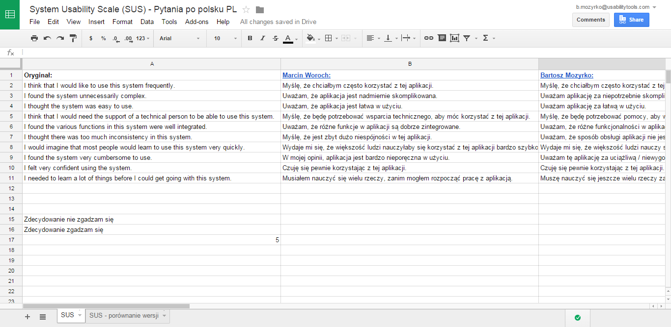 Ostatnio coraz częściej natykam się na pytania dotyczące tłumaczenia SUS na język polski. Ponieważ sam potrzebowałem kiedyś pomocy przy takim zadaniu, zebrałem różne tłumaczenia w jedno miejsce i udostępniłem na Google Docs: